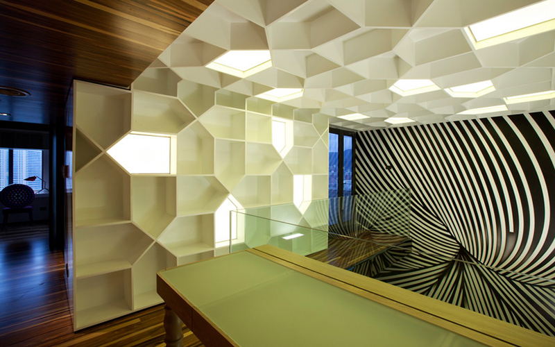 - 都市生活是快節(jié)奏的樂章,簡潔有力則是這篇樂章最相稱的和弦音。本案中設(shè)計師緊扣簡約、雅致的風格調(diào)性,在開辟出強大的使用功能和儲物功能的同時,對這個復式小樓重新做出戲劇性的布局: 開放式的廚房和加長的島臺使得家人、朋友可以盡享互動的樂趣;極富樂感黑白線條放肆的流動游走,白得極致的格子書柜貫穿二層的開放式書房甚至布滿整個天花;一個運用清玻和黑色鏡鋼以及玉砂夾膠鏡搭建的跨越客廳上空的L形天橋,讓動靜分明的功能分區(qū)也由此而獲得自然的過渡,空間也因此有了極強的層次感。而那一抹極為耀眼的芥末黃更是變成了樂譜上跳動的音符,劃破了本來的寧靜,為這個家?guī)砹松畹膼倓?。精心的?gòu)思及巧妙的用色,使得整個空間宜動宜靜,樂活而又型格。